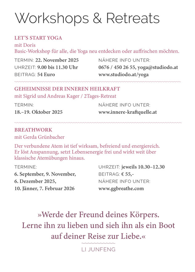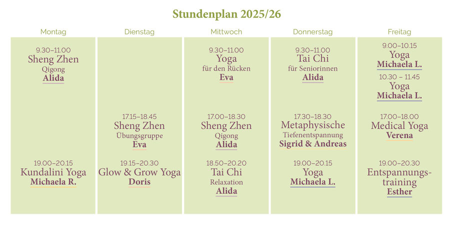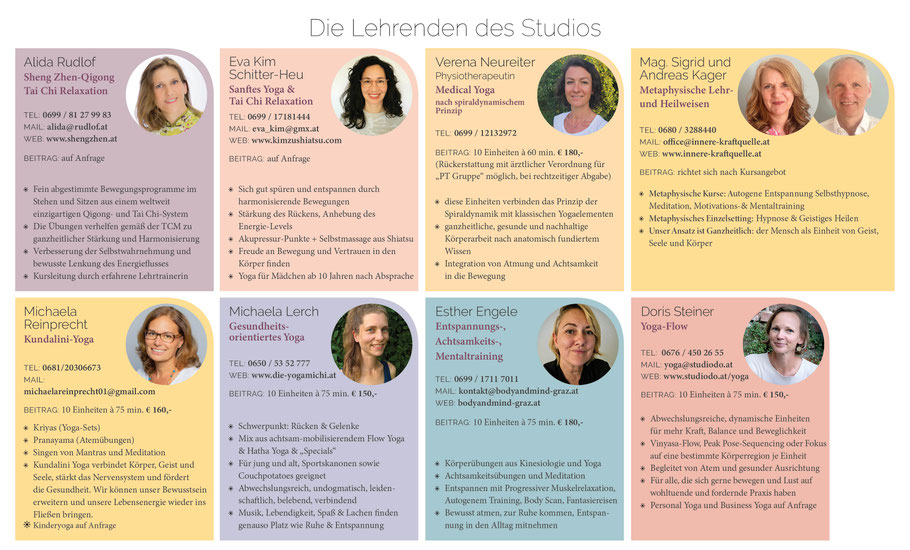 Studioräumlichkeiten auch an andere Kursleiterinnen, die im Bereich Yoga, Meditation und Tiefenentspannung tätig sind, vermietet. Im untenstehenden Stundenplan sind alle Kurse, die im Studio